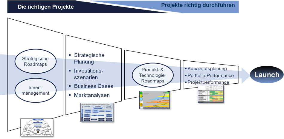 Eine enge Ressourcensteuerung lässt sich nur durch straffes Projektmanagement erreichen. Erfolgreiche Produkte der FuE-Abteilungen sind die wichtigsten Treiber für zukunfts-sichernde Innovationen. Sie sind die wirtschaftliche Lokomotive. Größtmögliche Effizienz und Effektivität sind die Ziele. Unsere Best Practice-Prozesse aus der Industrie helfen dabei, schnell dieses Ziel zu erreichen.